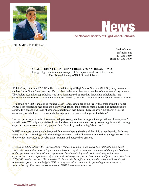 LSI Media is excited to announce that our Intern, Lucas Grant has been invited to the National Society of High School Scholars.